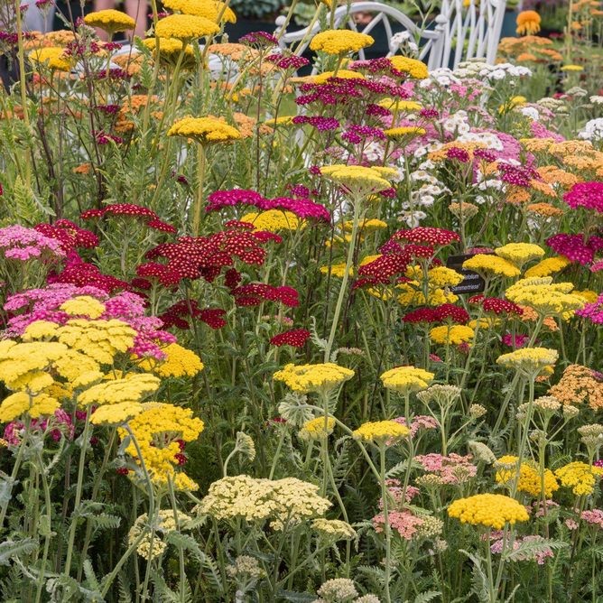 Colores varios. Planta perenne rústica de flores en forma de paraguas. Resiste sequía, ideal para climas cálidos. Florece en primavera y verano.