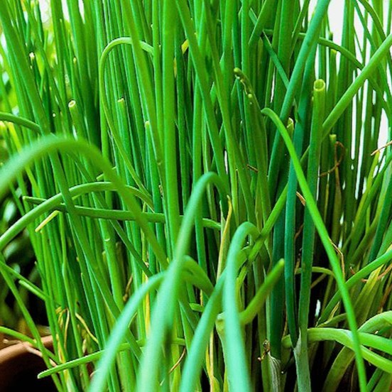 Aromática de hojas finas y alargadas con sabor similar a la cebolla. Resistente al frío, crece todo el año en climas templados. Se cosecha cortando las hojas sin afectar la planta. Sus flores violetas son comestibles y decorativas. Maceta N°10.