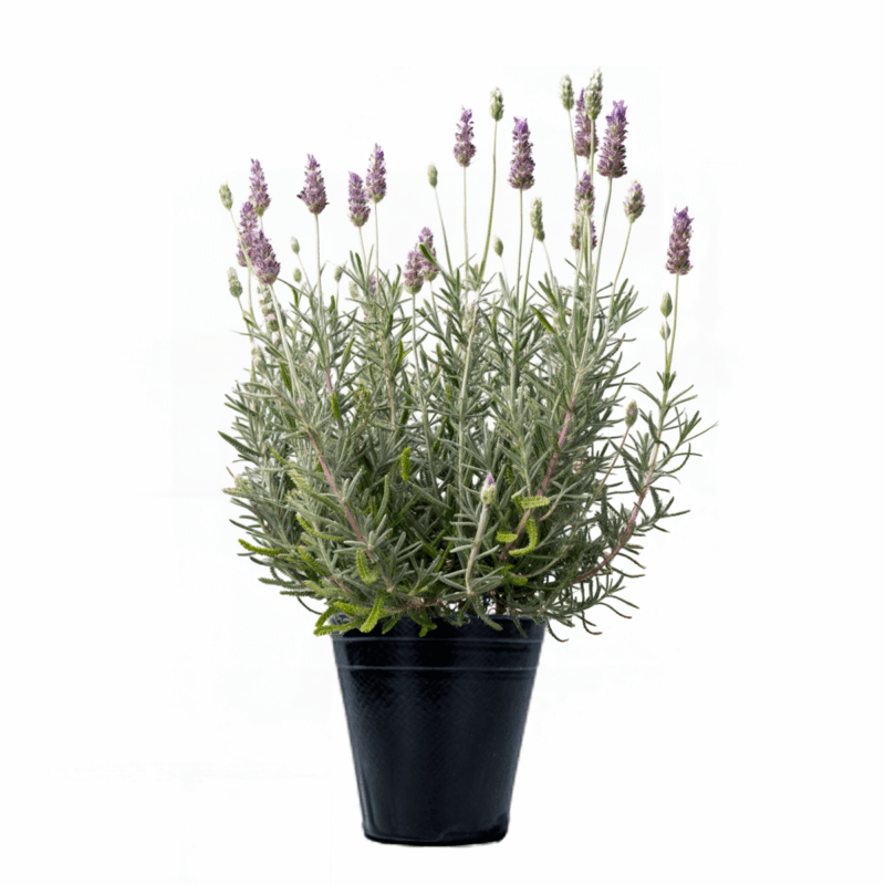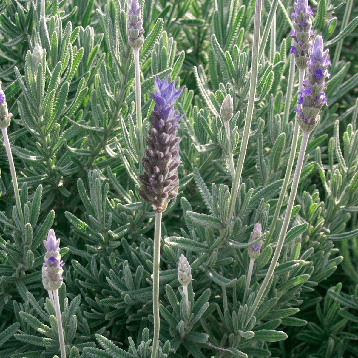 Perenne. Variedad de lavanda con flores violetas y fuerte aroma. Se adapta a suelos secos y soleados. Florece en primavera y verano.