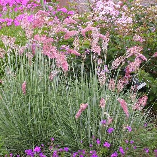 Gramínea ornamental con espigas rosadas y follaje verde. Muy decorativa en jardines xerófitos y bordes de senderos. Prefiere pleno sol y suelo bien drenado.