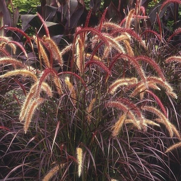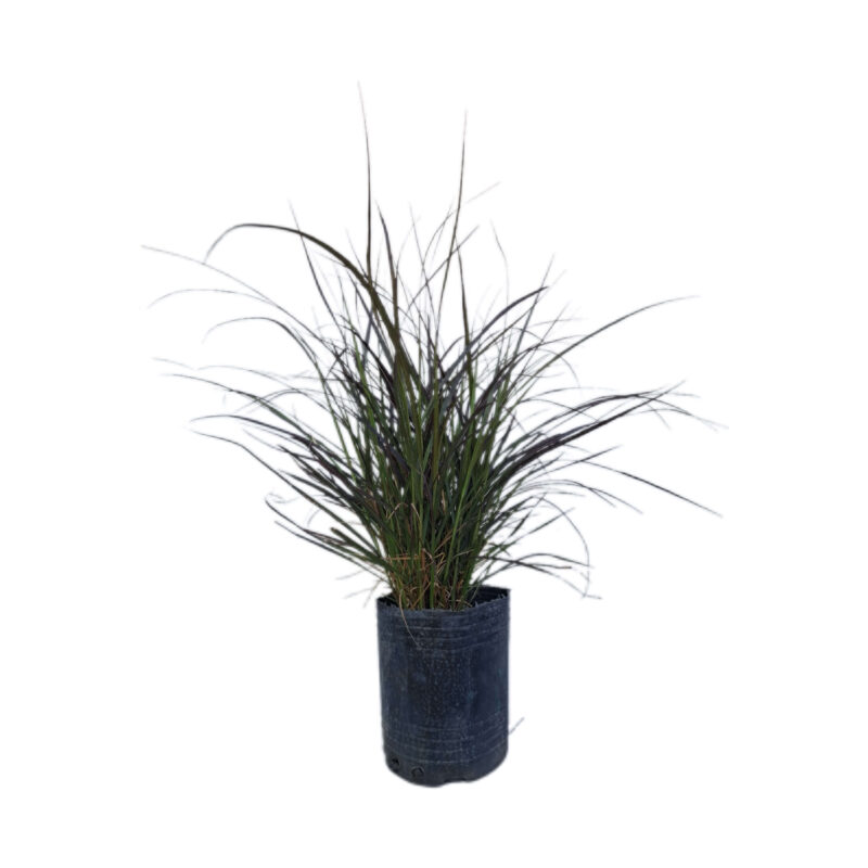 Gramínea ornamental de follaje arqueado en tonos rojizos y espigas plumosas que aportan movimiento al jardín. Ideal para borduras, macetas y jardines xerófitos.