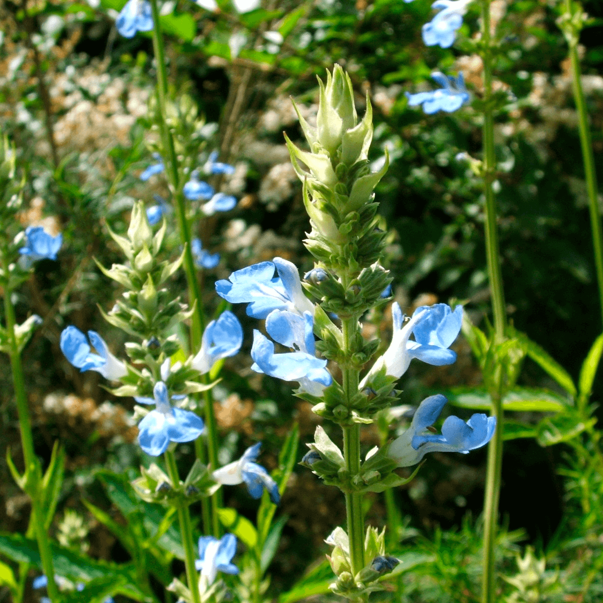 Perenne. Planta rústica con espigas florales de color celeste. Se adapta a suelos húmedos y tolera el frío. Florece en verano y otoño.